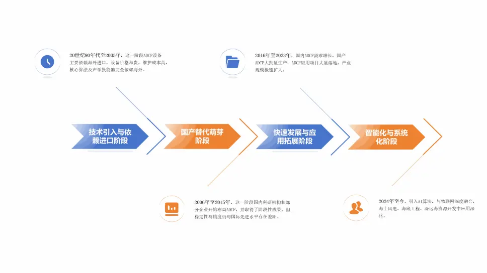 国内ADCP发展按技术发展脉络、应用场景、市场态势等来回顾整个发展历程,大致细分为4个发展阶段,分别是技术引入与依赖进口阶段、国产替代萌芽阶段、快速发展与应用拓展阶段、智能化与系统化阶段。
