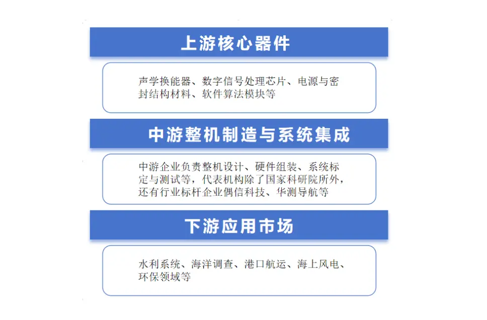 上游核心器件包含声学换能器、数字信号处理芯片、电源与密封结构材料、软件算法模块等。中游整机制造与系统集成,中游企业负责整机设计、硬件组装、系统标定与测试等,代表机构除了国家科研院所外,还有行业标杆企业偶信科技、华测导航等。下游应用市场主要集中在水利系统、海洋调查、港口航运、海上风电、环保领域等,整体来看,下游市场正呈现由科研主导向工程应用驱动转变的趋势。